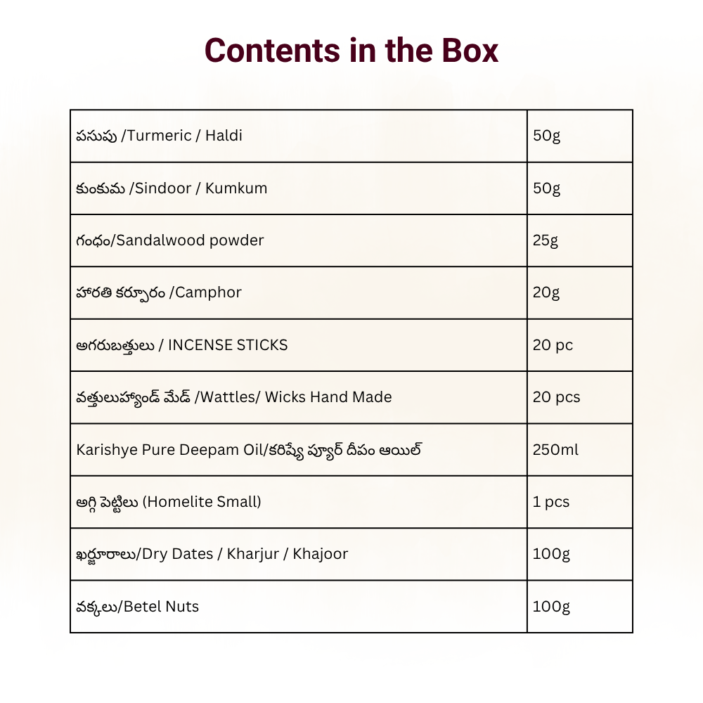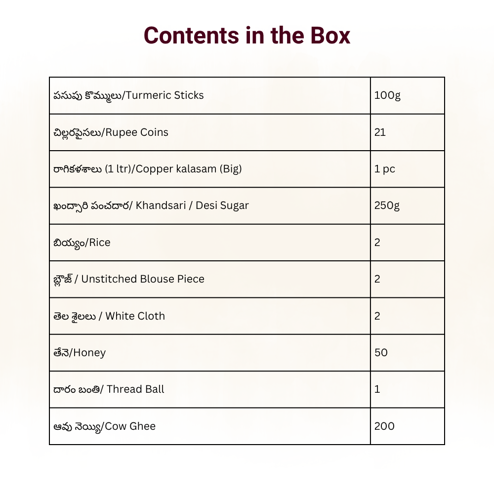 Whether you're performing the puja for the first time or continuing a cherished family tradition, this kit ensures your vratham is complete, sattvic, and stress-free.