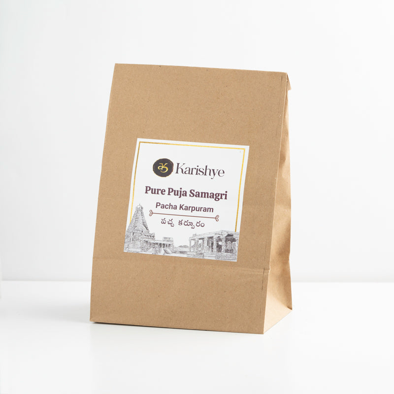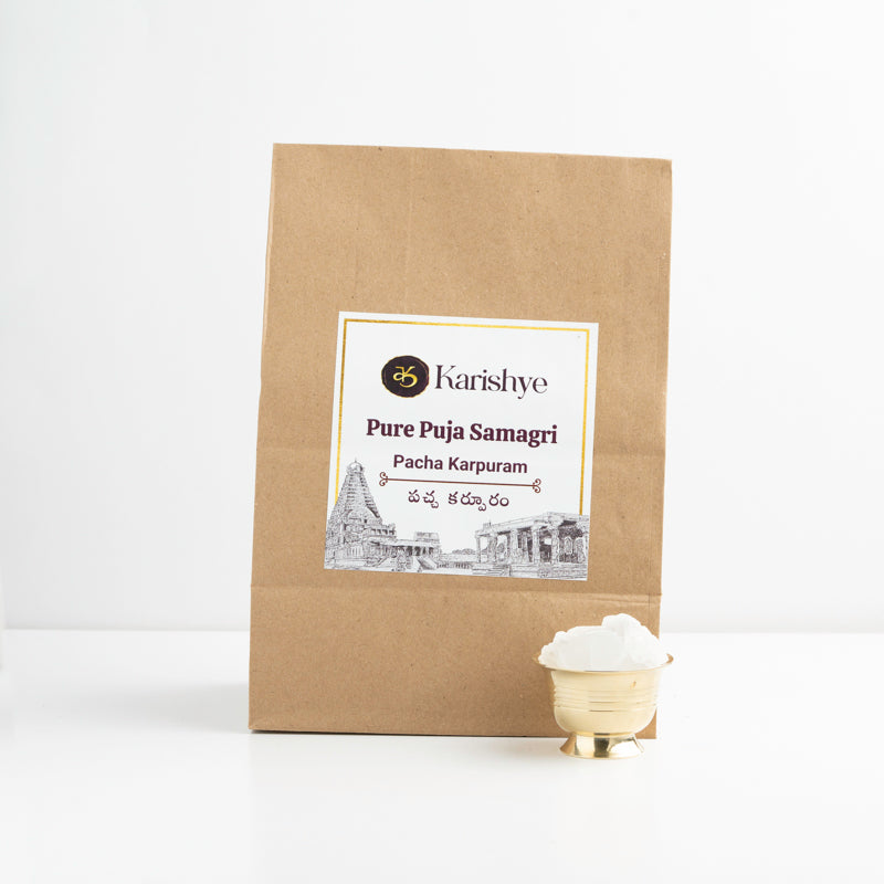 Pacha Karpooram / పచ్చ కర్పూరం (Raw Camphor) is a sacred element in Hindu rituals, known for its strong fragrance, purifying properties, and spiritual significance. It is widely used in religious ceremonies to cleanse the atmosphere and invoke divine blessings.
