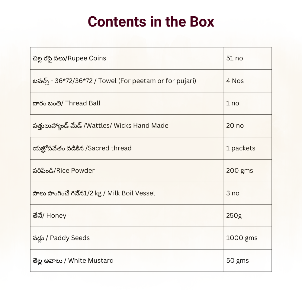 • Sacred thread (yajnopaveetam), darbha, kusa grass, samithu, and all homa dravyas