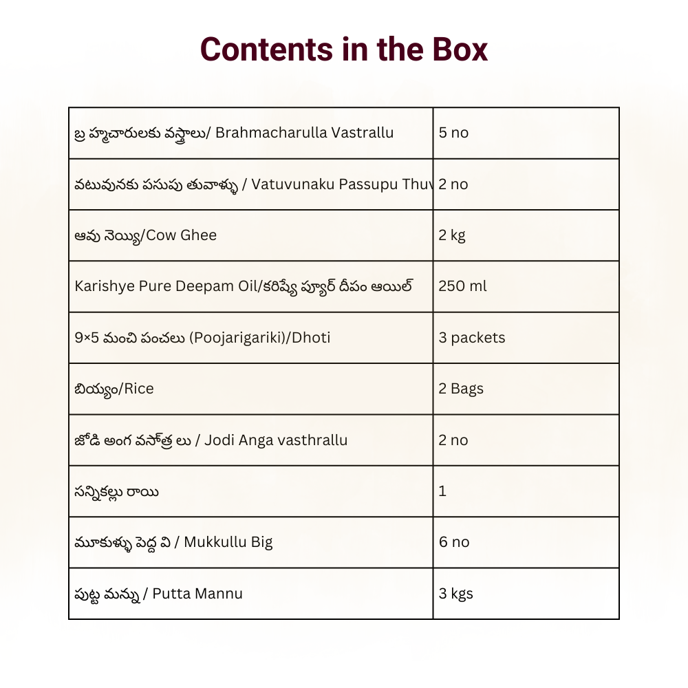 Upanayanam, also known as the sacred thread ceremony or ఒడుగు, marks the initiation of a young boy into Vedic learning and the path of dharma. Karishye’s Upanayanam Kit is a complete, tradition-verified set of all puja essentials required for this once-in-a-lifetime samskara.